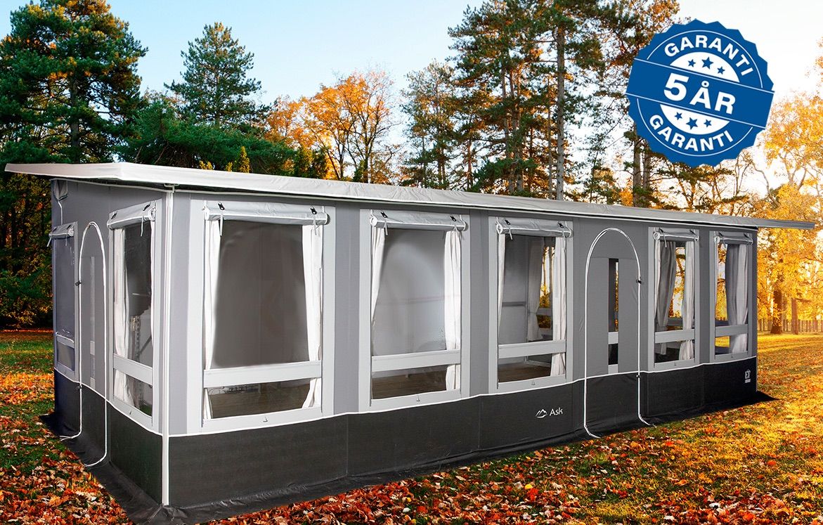 Det er slut med at sætte fortelt op og tage det ned igen. Hvis du vil have vognen med på tur er det heller ikke noget problem. Ask står lige sikkert i al slags vejr med en ekstrem stabil og sikker konstruktion som er udviklet til selvmontering. Teltet kommer i fire modeller, de tre af dem har dybde på 3 meter og måler 4,54 meter, 5,7 meter og 6,87 meter i bredde og det sidste har dybde på 3,5 meter og måler 7,27 meter i bredde. Ask er fremtidens telt som tilbyder den optimale løsning for en behagelig og enkel camping hele året.
