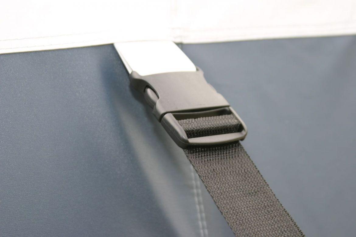 Mange af vores fortelte er klargjort til denne stormsikring, med hurtigkobling fastmonteret på hver gavlvæg. Nogen af modellerne som er klargjort til dette, er alle Classic-modeller, Prestige, Royal og Universal Helårstelt. Sættet består af to kraftige fæstebånd, to stålfjærer og to T-plugger i stål. Vægt ca. 2 kg.